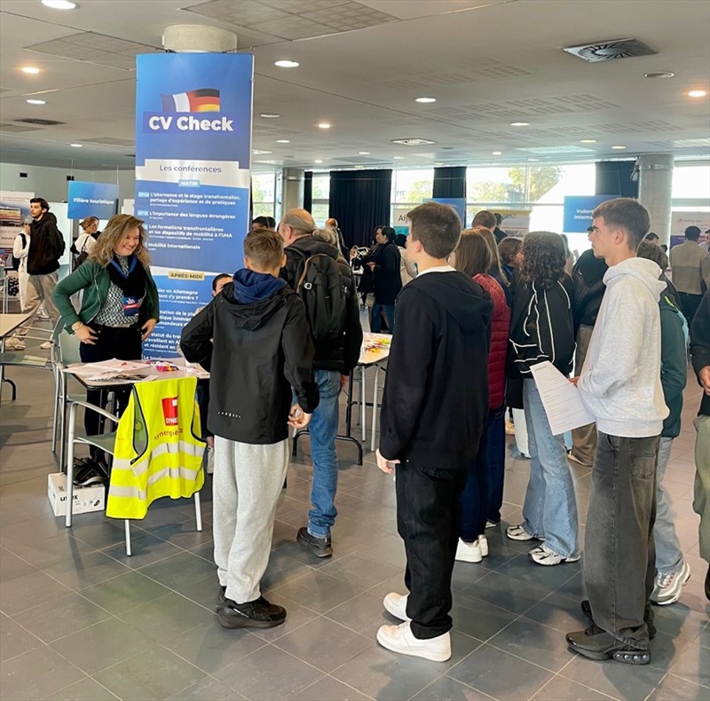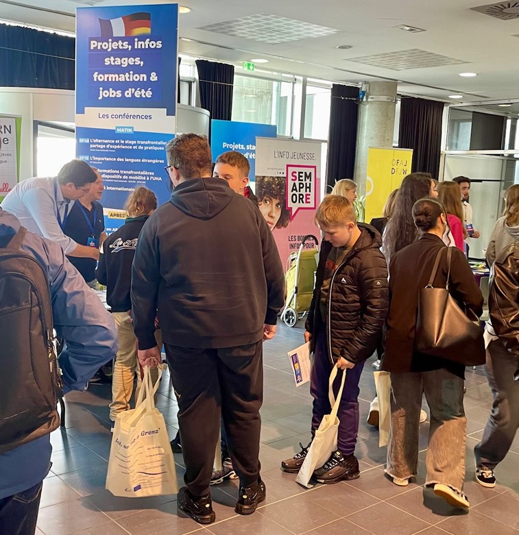 Le 18 septembre 2024, une vingtaine de 4e & 3e du collège Rémy Faesch et autant d'élèves de 1ère du lycée Scheurer Kestner de Thann se sont retrouvés pour une sortie au salon « Warum nicht? » de Mulhouse, salon des formations et emplois franco-allemands. |