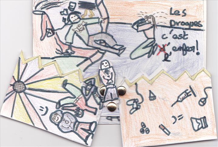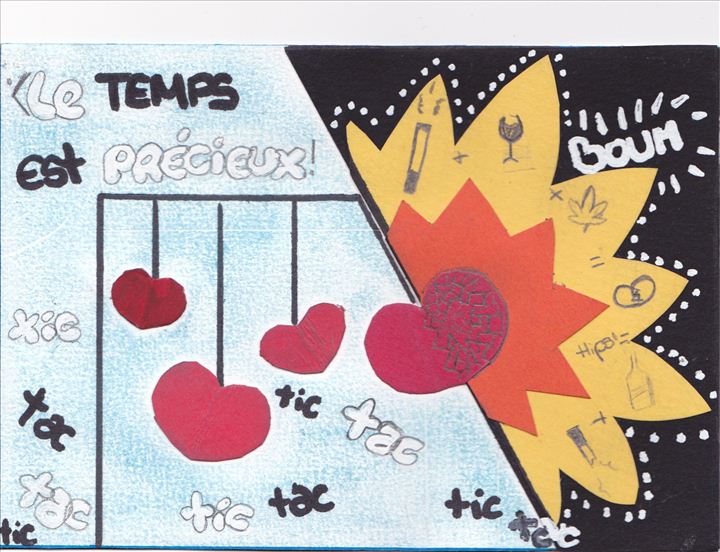 Comme chaque année, les élèves de Mme Gangloff participent au concours départemental autour du thème des addictions (drogues, alcool, tabac, etc...). Cette année les élèves de 4ème ont eu à plancher sur un support plus petit qu'à l'accoutumée: une carte postale. En tout cas ce nouveau support n'aura pas bridé leur imagination, comme vous pourrez le constater ci-dessous. Voici un échantillon de quelques unes des cartes qui vont concourir. Si vous souhaitez les voir toutes, vous pouvez passer au CDI où elles sont exposées en attendant leur expédition aux organisateurs du concours. Cliquer sur la photo qui vous intéresse puis cliquer avec la souris sur la partie droite de la photo (bouton "Next") pour la photo suivante, ou bien sur la partie gauche de la photo (bouton "Prev") pour revenir à la photo précédente. |