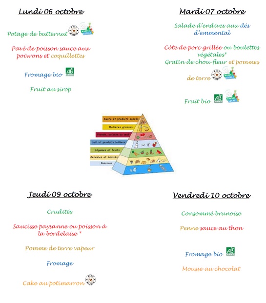 Voici le menu de la restauration scolaire pour la semaine. Si celui-ci ne s'affiche pas correctement, vous pouvez actualiser l'affichage de votre navigateur en appuyant sur la touche F5, en haut de votre clavier. |