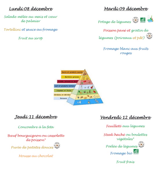 | Voici le menu de la restauration scolaire pour la semaine. Si celui-ci ne s'affiche pas correctement, vous pouvez actualiser l'affichage de votre navigateur en appuyant sur la touche F5, en haut de votre clavier. |