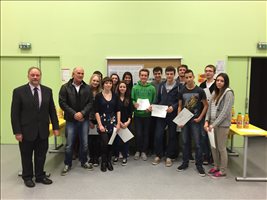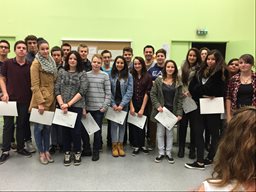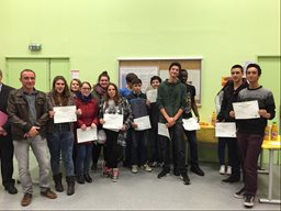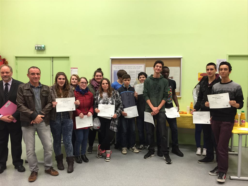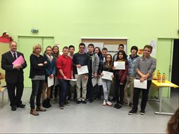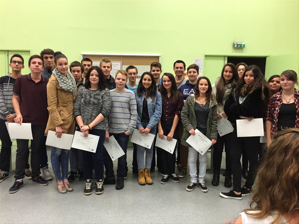 C'est une cérémonie un peu particulière que le collège Faesch a accueillie vendredi 28 Novembre, en effet pour la première fois les élèves de 3e de l'an passé ont été conviés pour une remise des diplômes du Brevet par le Principal, M. Grunenwald. La session 2014 a été marquée une fois de plus par les excellents résultats obtenus par les élèves du Collège Faesch, puisque 94.8% des candidats ont été reçus (la moyenne académique étant de 85,6%). Une belle moisson de mentions également puisque 70% ont décroché une mention (16 mentions TB, 13 mentions B et 22 mentions AB) ! La plupart de nos ex-3e ont répondu favorablement à l'invitation et sont venus recevoir leur premier diplôme des mains de leur ancien professeur principal. Les élèves, comme les enseignants venus à leur rencontre, ont pu partager un moment fort sympathique durant ces retrouvailles. Les rires, la joie, les applaudissements et les "selfies" n'ont pas manqué au cours de cette soirée... Une bien belle tradition qui débute au Collège Faesch désormais... |