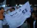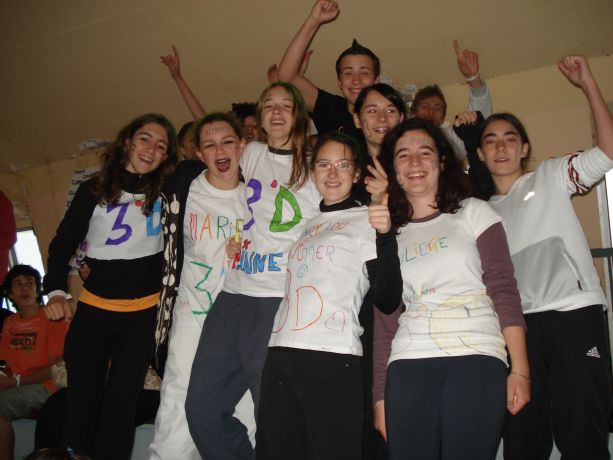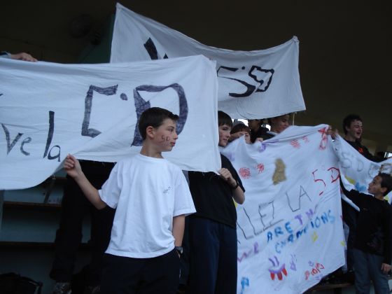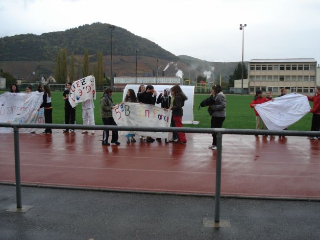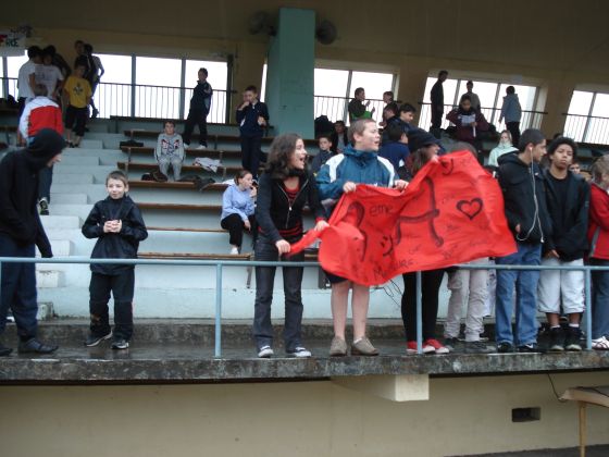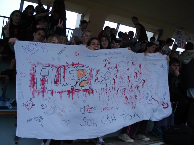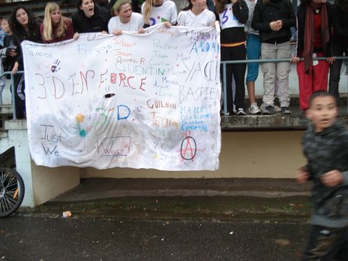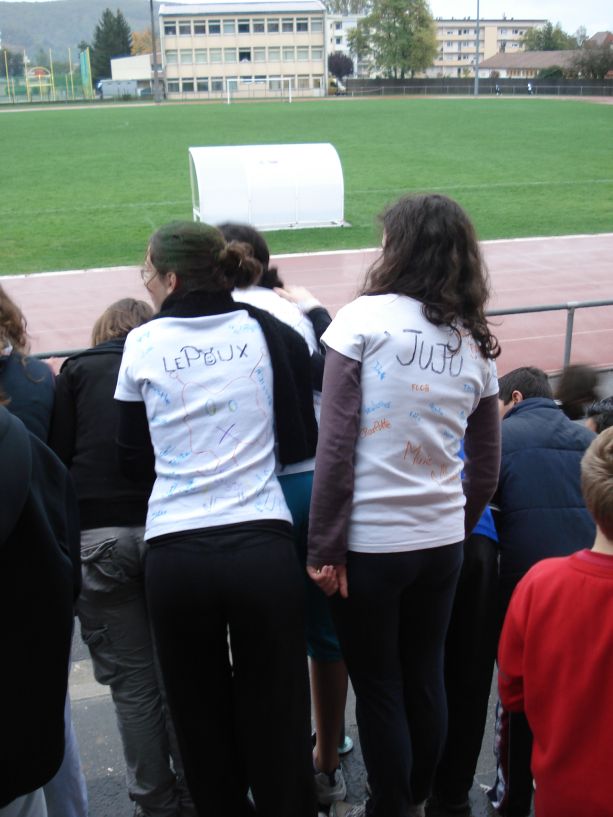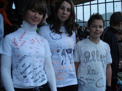 Cette année les élèves semblaient s'être passés le mot et les coureurs ont pu bénéficier de groupes de supporters impressionnants ! C'est ainsi que les gradins du stade municipal ont vu fleurir banderoles et T-Shirts décorés à la gloire d'une classe ou d'un élève. Cet enthousiasme s'est même traduit par diverses "peintures de guerre" corporelles. En tout cas ce n'était pas une ambiance de frimas d'automne que nous ont offert les élèves du collège ! |