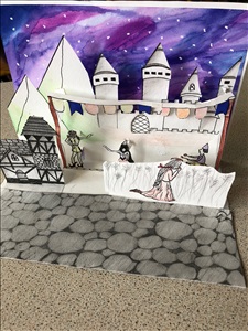 Puis, les élèves ont travaillé sur une rédaction en Français, sous la forme d'un roman de chevalerie, utilisant les éléments vus en cours d'Histoire et lors de la journée Moyen Age.