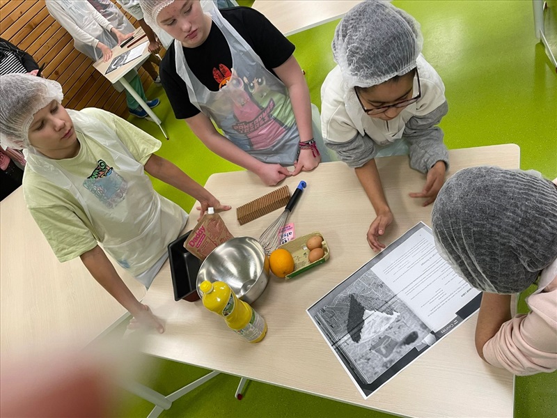Répartis en petits groupes, ces jeunes cuisiniers d’un jour ont alors pu apprendre à faire un carrot cake et un pain d’épices. Sous la surveillance du chef, les jeunes ont dû lire les recettes et rassembler les ingrédients. Une belle occasion d’apprendre des gestes techniques, du vocabulaire mais aussi de coopérer. |
