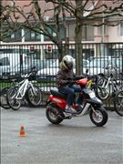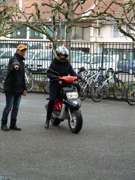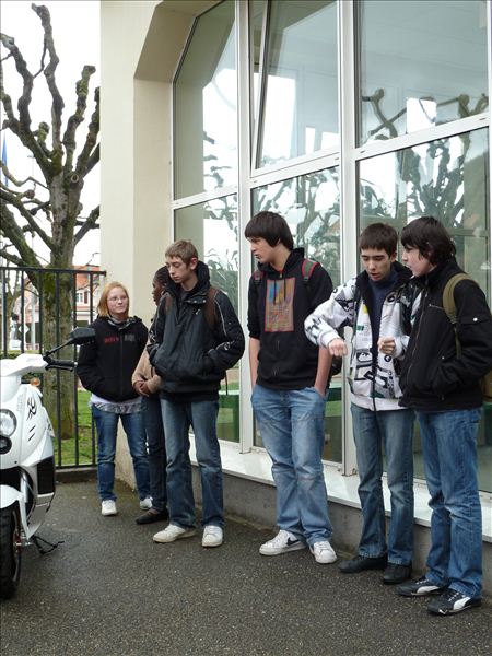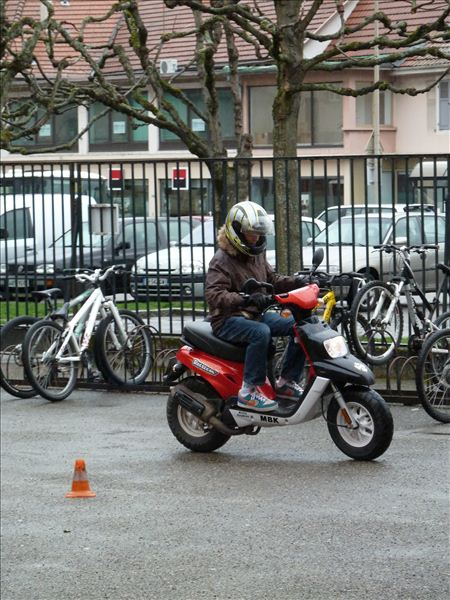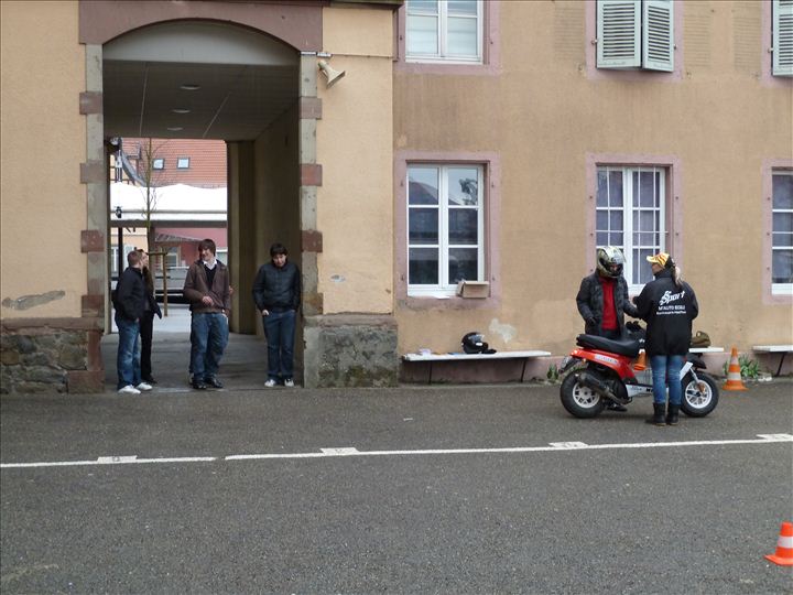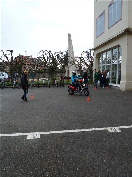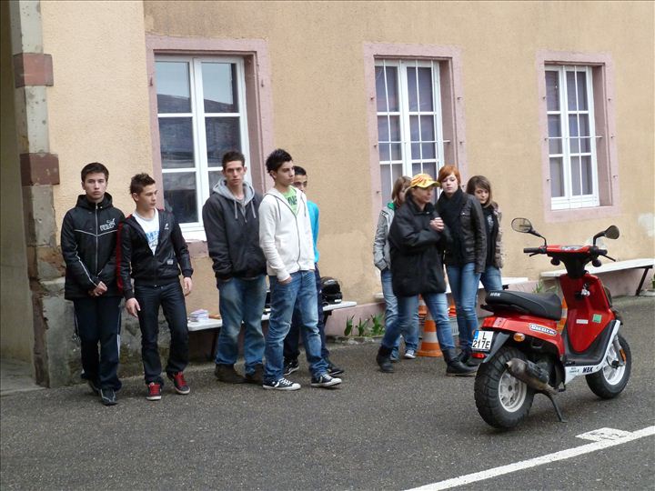 Pour les 5èmes, il s'agissait d'une animation de deux heures, menée par Mme Muriel Dietmann, basée sur la sécurité routière aussi bien des piétons, des rollers, des cyclistes ou des deux roues. Les 3èmes, quant à eux, ont pu profité durant 2h de quatre ateliers, le jeudi 31 mars: un atelier conduite d'un cyclomoteur sur parcours, mené par l'Auto-Ecole Sport; un atelier entretien d'un cyclomoteur, animé par le garage KTM/Kuttler; un atelier de simulateur de deux roues, organisé par la Macif Prévention; un atelier d'information sur les lois en vigueur, mené par la Gendarmerie de Thann. |