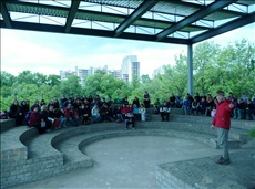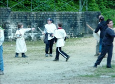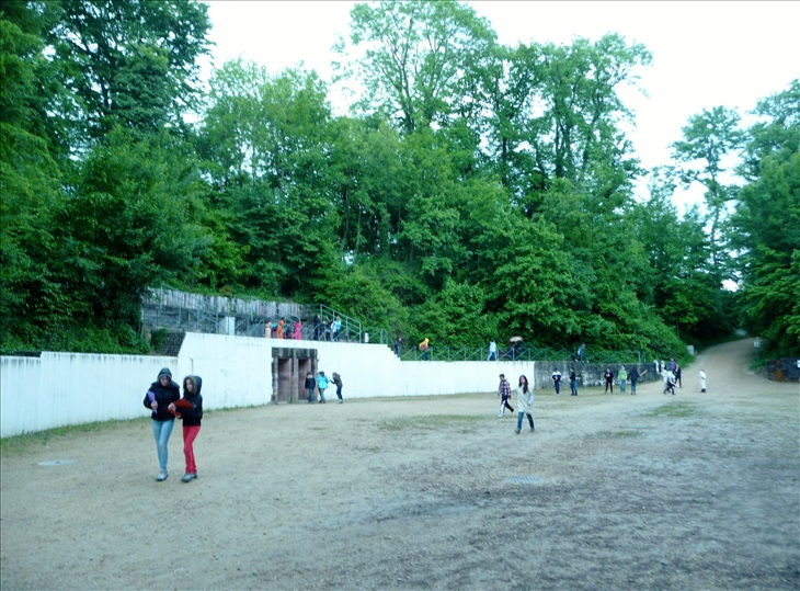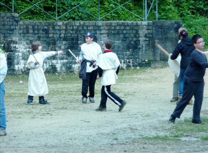 A l’amphithéâtre, en pleine nature, ils ont pique-niqué en profitant d’un ciel miraculeusement clément jusque-là et certains ont organisé des combats de gladiateurs sur l’arène avec épées et boucliers de bois tandis que d’autres revêtaient la toga des citoyens, la stola des romaines ou la tunica des esclaves.