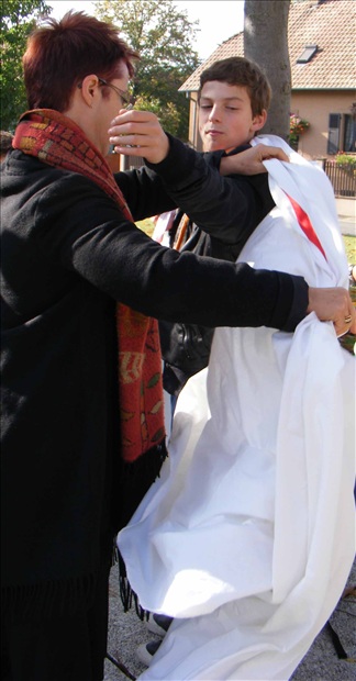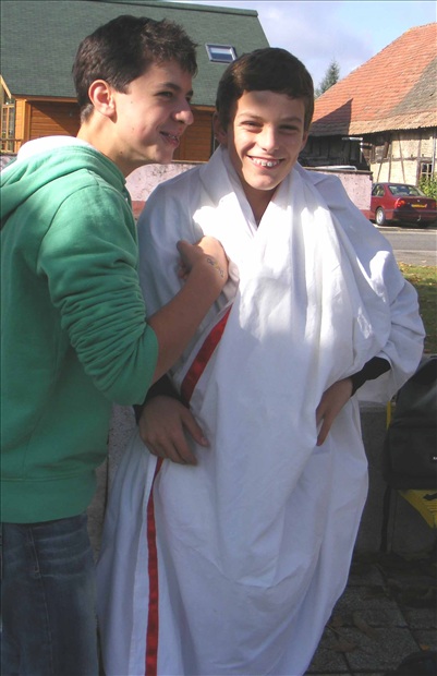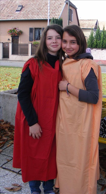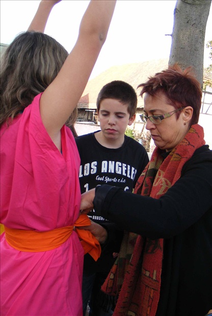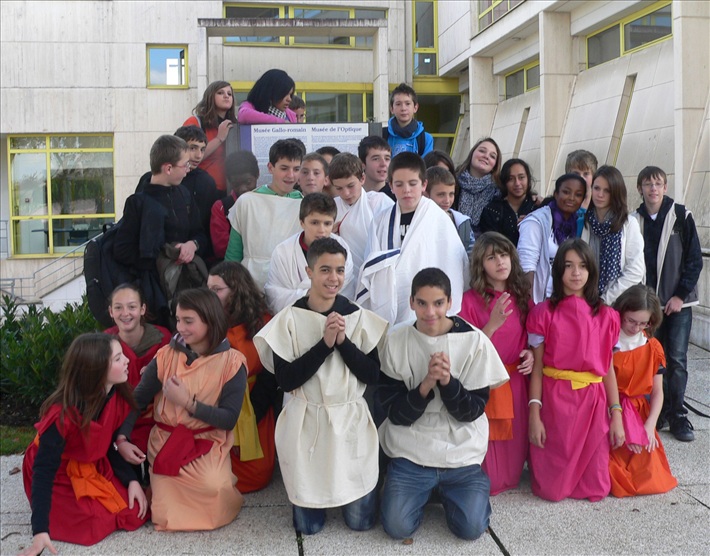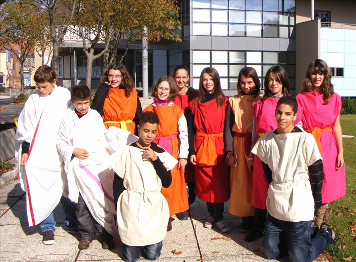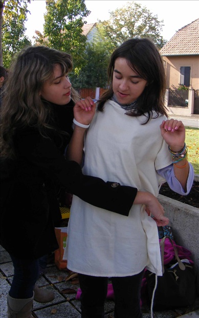 Après un prandium (déjeuner romain) partagé entre 5° latinistes et 4° sur le parvis ensoleillé du Capitole, ils se sont habillés en romain, qui d’une toge de citoyen, qui d’une stola de romaine, qui d’une tunica d’esclave -sans oublier M. Ferrari !-, avant de regagner le collège pour les cours de l’après-midi. |