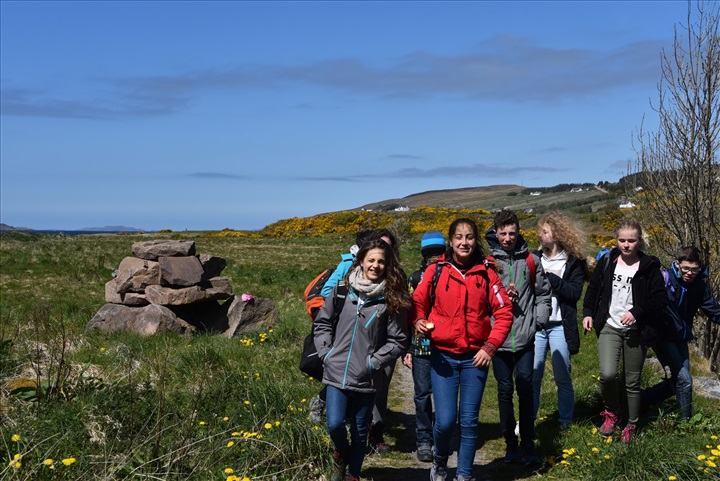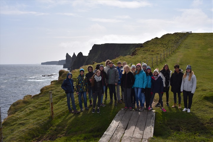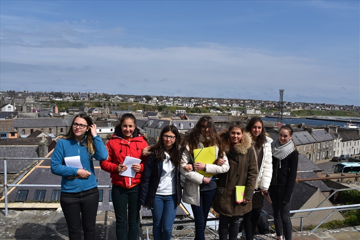 11 Mai En route vers la pointe la plus septentrionale de l’écosse. Badbea: une falaise balayée par les vents où les paysans, évincés de l'intérieur des terres pour faire place à l'élevage intensif des moutons, furent relogés au 18e et au 19e siècle. Témoignage d'une époque douloureuse dans l'histoire des Highlands Mots du jour: maisonnettes en ruine - terres arides - genêts maritimes - vent - falaise abrupte - moutons - oiseaux - monument Wick: ville qui a connu son apogée pendant près de 200 ans lorsque la pêche au hareng était florissante. Nous avons visité un musée dédié à l'histoire de la ville. Ce musée est tenu par des bénévoles qui nous ont reçus chaleureusement et nous ont guidés à travers le musée, fiers de nous présenter leur travail de mise en valeur du patrimoine. Une dame importante nous a accueillis: elle a le titre de Lord Lieutenant et est la représentante de la reine en Écosse. Elle est invitée aux mariages royaux et nous a montré des photos. Mots du jour: photos - vieux objets - bateaux - phare - harengs - paniers à poissons - dur labeur John O' Groats: nous sommes allés observer des oiseaux de mer dans les falaises. Nous avions travaillé sur un projet en cours et chaque groupe a présenté l'oiseau qu'il avait étudié. Depuis la côte, nous voyions les Orcades. Mots du jour: étendues vertes - moutons partout - falaises - vent - macareux - pingouins torda - guillemots - cormorans huppés - goélands - cris et odeurs de fiente 12 Mai Torrisdon Bay: sur la côte Nord. Nous avons roulé pendant deux heures à travers des immensités de landes où l'ont voit une maison de temps en temps. Un ranger nous attendait pour nous guider dans une randonnée au bord de la mer. Après avoir traversé une tourbière, nous nous sommes retrouvés sur une magnifique plage de sable blanc, nous avons pique niqué dans les rochers. Mots du jour: sable - œufs de raie et de roussette - traces de loutres - coquillages - bruit de vagues - marée basse - oiseaux - vent - ruines de "Broch" - plantes - chevaux - odeurs de mer. Ceilidh: le soir, nous nous sommes retrouvés pour une fête traditionnelle, une soirée de chants et de danses au cours de laquelle des élèves français et écossais ont joué de la musique et chanté. Nous avons été initiés à des danses écossaises. Les parents avaient préparé un magnifique buffet de gâteaux. 13-14 Mai Dans les familles des correspondants. |