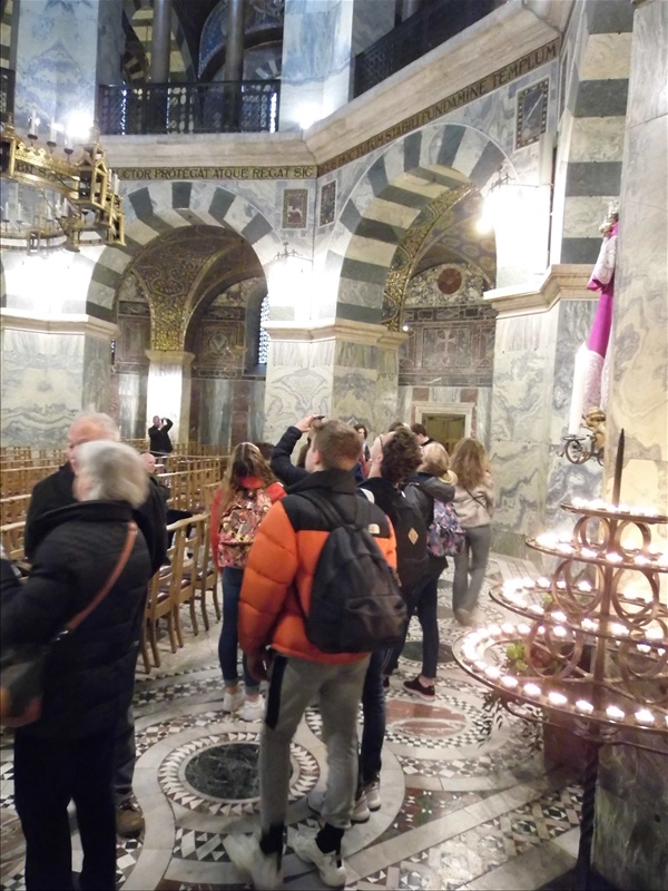 Nous pouvons admirer la magnifique architecture de cette chapelle construite sur un plan octogonal. Nous avons même eu la chance de pouvoir admirer le trône sur lequel tous les empereurs carolingiens se sont assis (sauf Charlemagne car le siège n’a malheureusement pas pu être achevé avant sa mort).